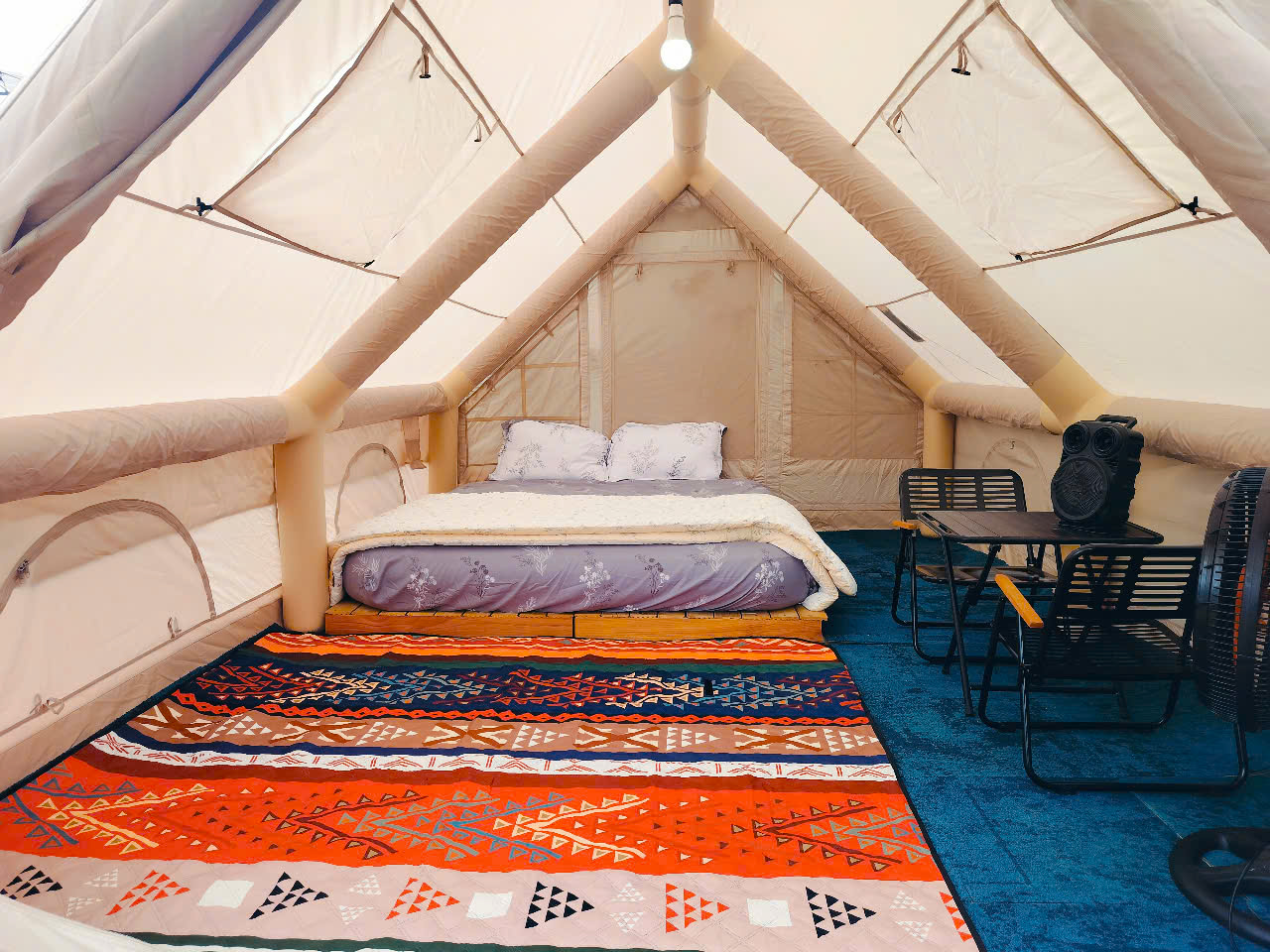 Lều 12m², đệm, quạt & đèn chiếu sáng