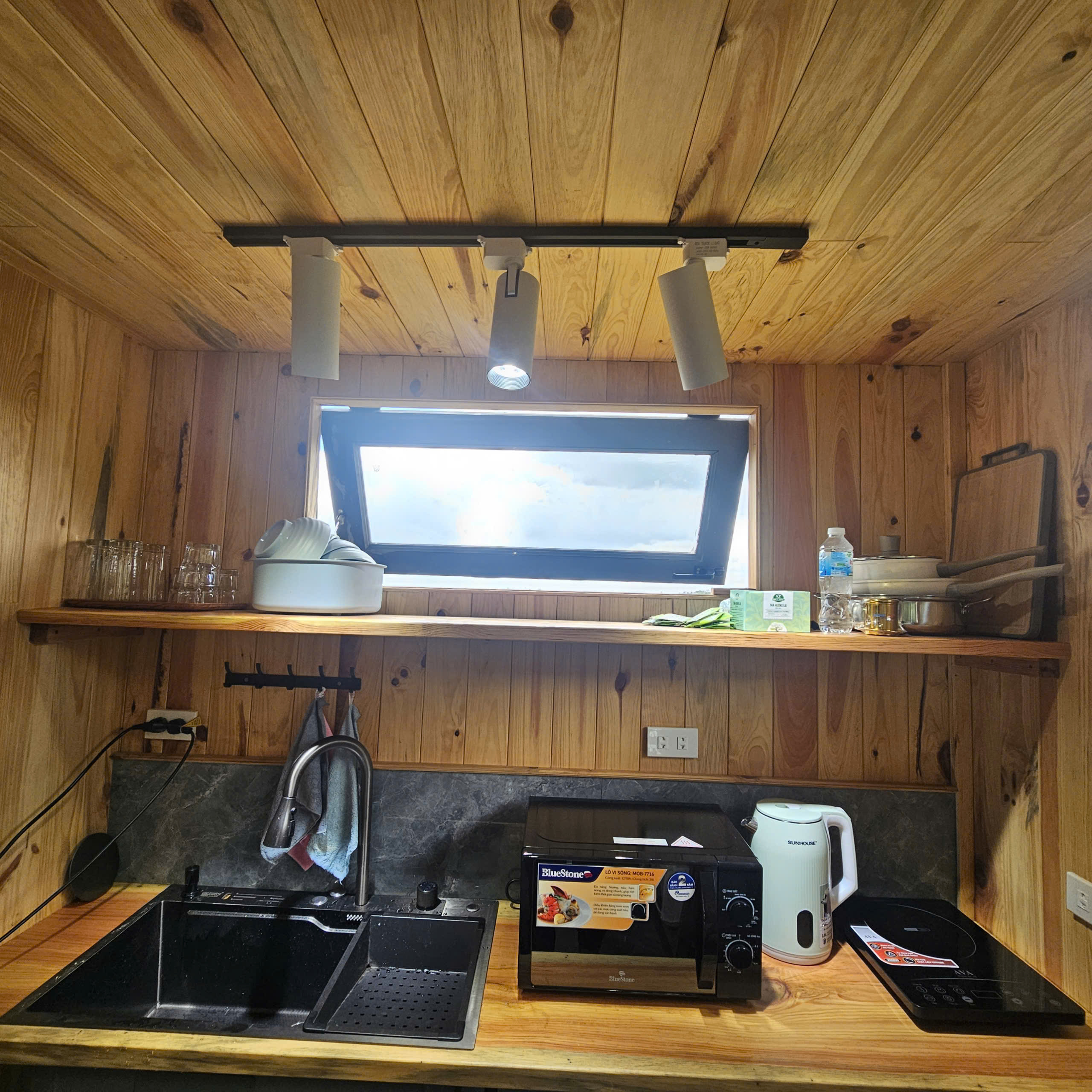 Villa có bếp riêng đầy đủ tiện nghi (bếp từ, nồi, chén, tủ lạnh, máy rửa chén).